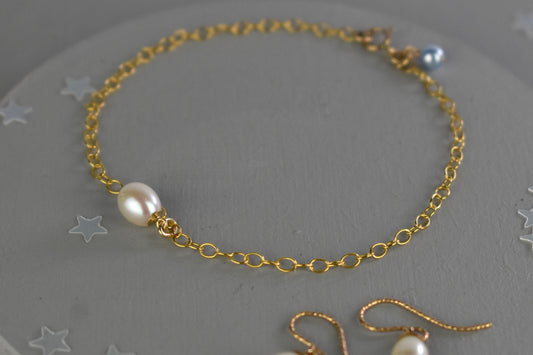 • Something blue gift set shown in gold filled finish. Freshwater pearls. on a lariat necklace, chain bracelet both finished with a tiny blue crystal or pearl. Matching freshwater pearl earrings on gold plated wires.