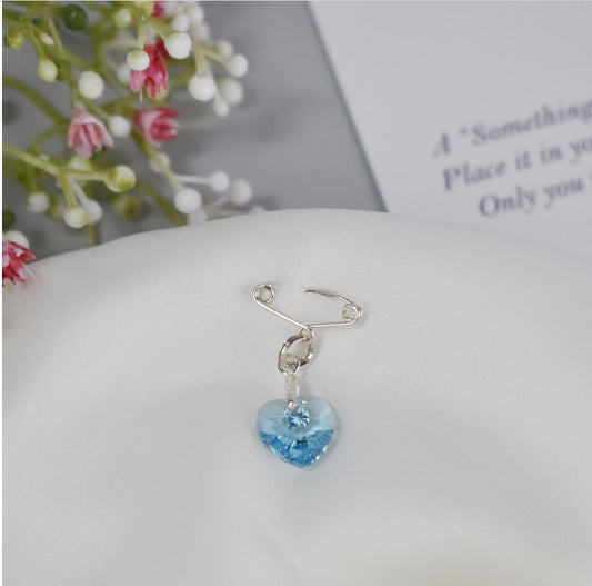 • Sterling silver engraved heart and trigger clasp with tiny blue crystal . For Bride's bouquet, shoe, inside the gown or wherever she wishes to use it.