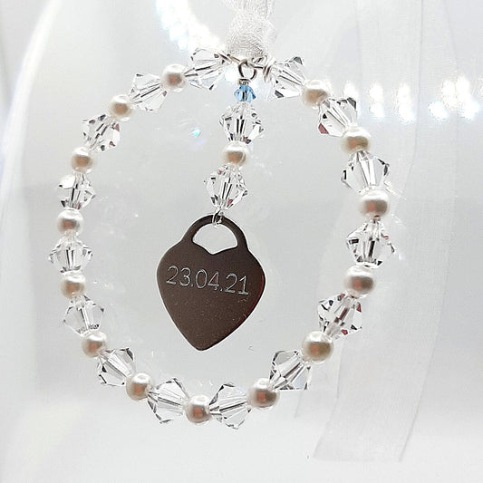 • "Personalised wedding bouquet charm with engraved silver heart, crystals, pearls, and 'Something Blue' bead."
