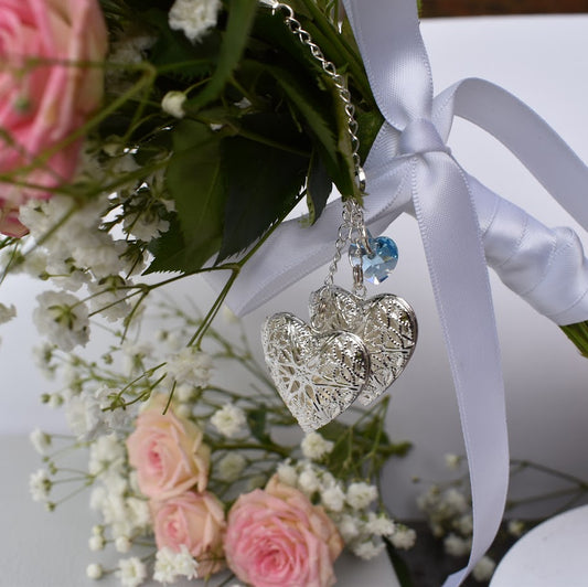 • sterling silver heart shaped locket for two photos, accompanied by a blue crystal heart and threaded through a sterling silver loop. Ribbon supplied for you to attach to your bouquet. Easily detach the locket later to wear with a chain.